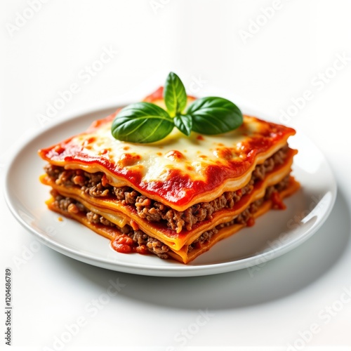 Italian lasagna dish on white plate. Baked layered pasta with meat, cheese sauce. Fresh basil leaves on top. Perfect food photo for restaurant menus food delivery apps. Tasty, appetizing dish ideal