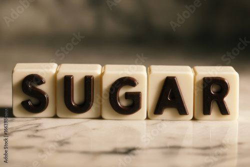Ivory cylindrical blocks spelling “SUGAR” with chocolate letters, arranged neatly on a marble surface with soft natural light.