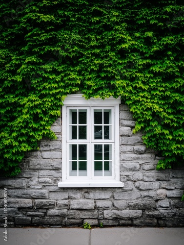 Ivy Covered Stone House Wall with White Window - Serene symbolizing nature's embrace, quietude, growth, hidden beauty, and peaceful sanctuary