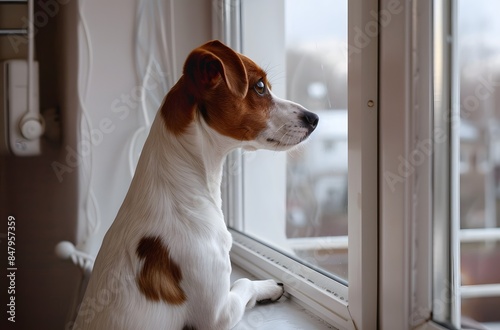 jack russel terrier, dog, window, half face, looking out, waiting, owner, home, loneliness, house, pet, animal, interior, daylight, anticipation, isolation, longing, domestic, canino, solitude, watching, inside, cute, faithful, indoor, alert, friends, companion, emotional, scene, ordinary, life, simple, glasses, view, furry