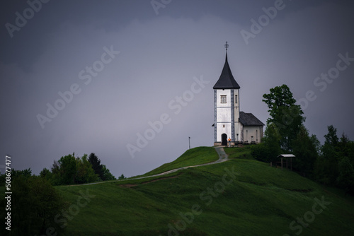 Jamnik church on top of the hill on a moody and stormy day after the rain.