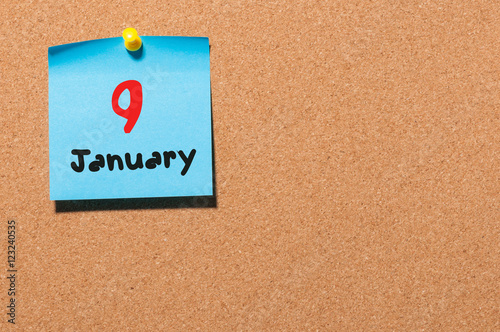 January 9th. Day 9 of month, Calendar on cork notice board. Winter time. Empty space for text