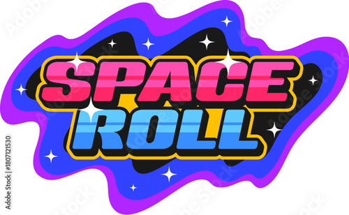 Japan seafood sushi space roll retro Y2K sticker or symbol. Sushi gourmet retro tag, Japan seafood dish Y2K vector patch. Japanese cuisine delicacy sticker with space galaxy stars and retro typography