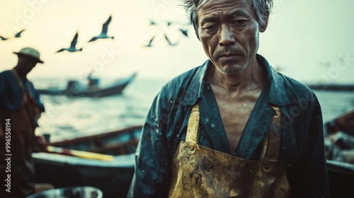 fisherman, japanese, closeup, portrait, water, boat, ocean, bird, coastal, traditional, attire, labor, sea, nature, expression, morning, community, work, lifestyle, man, character, rugged, weathered, environment, fishing gear, authenticity, heritage, tranquil, rural, working class, storytelling, solitude, skill, sharpened, culture, profession, landscape, craft, maritime, fishing, interaction, journey, dusk, industry, calmness, ocean life, dedication, effort