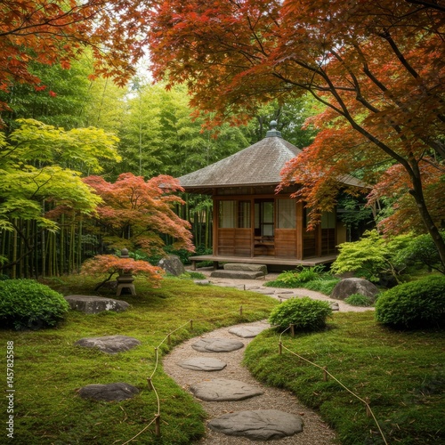 japanese, garden, pavilion, autumn, maple, tree, red, leaf, rock, path, stone, moss, bamboo, tranquil, serene, peaceful, nature, landscape, asia, zen, meditation, calm, quiet, wood, structure, building, house, hut, tea, shrine, green, orange, brown, yellow, foliage, plant, shrubbery, day, daylight, sunny, bright, scenery, view, photo, image, photo