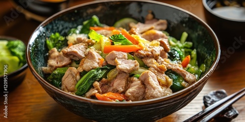 japanese, dish, boiled, pork meat, vegetable, dark, bowl, garnished, greener, colourful, pepper, wooden, table, cookery, food, meal, asian, healthy, fresh, traditional, epicure, ingredient, presentation, dining, eatery, receipe, wholesome, appetising, favor, seasonal, alimentary, catering, chef, vibrant, organic, side, platter, asian cuisine, delicacy, snack, lunch, dinner, delicious, texture, culinary