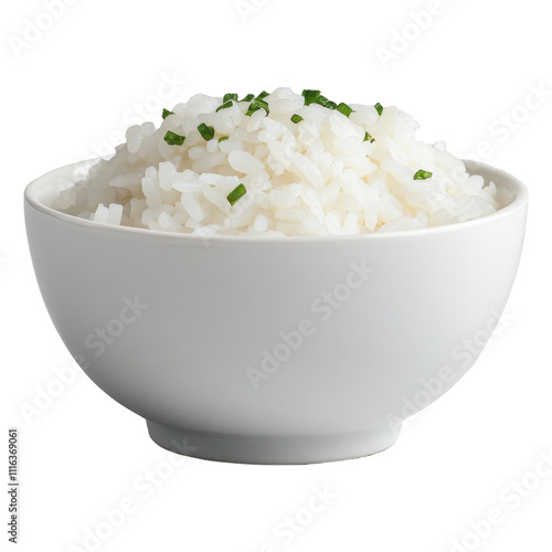 Japanese rice served in a whole white ceramic bowl on a transparent background.
