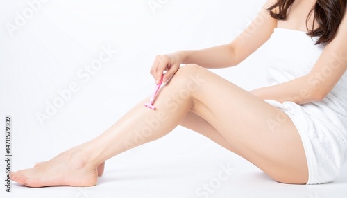 Japanese Woman Shaving Legs on White Background | 脚のムダ毛処理をする日本人女性