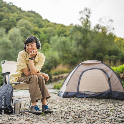 woman, mature, japanese, chill, river, camp, listen, music, earphones, audio, rythm, excited, tent, use, smile, forest, picnic, cheerful, to sit, ground, nature, holiday, cyberspace, technology, adventure, camping, travel, hobby, 1, copy space, fun, happiness, countryside, relaxation, female, outside, casual attire, enjoy, relax, smiling, beautiful, happy, day, resting