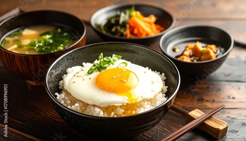 Japanese-style rice bowl with fried egg, miso soup, and side dishes