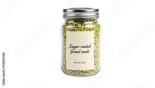 Jar of sugarcoated fennel seeds isolated on transparent background, a treat