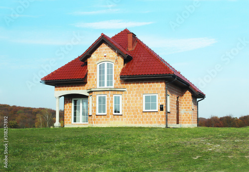 Jaslo, Poland - 7 8 2018: Modern design of a small single-family house located in a rural area. Designing buildings and landscape. New home for people. Red metal roof. Energy saving and greenhouse eff