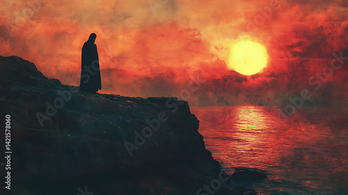Jesus silhouetted on a cliff edge at dawn, the dark form of Satan behind him barely distinguishable from the rocks. A light breaks on the horizon. Created Using: minimalistic spiritual symbolism,