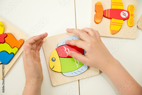 Jigsaw Baby Early Educational Toys 3D Puzzle Children Ability Exercise Kids Wooden Gifts. Boy hand on puzzle part. Early education, focus exercises