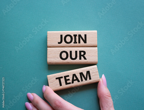 Join our team symbol. Wooden blocks with words Join our team. Beautiful grey green background. Businessman hand. Business and Join our team concept. Copy space.