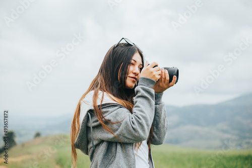 Joven fotógrafa mujer en una montaña. Concepto de Personas y Tecnología, Turismo.