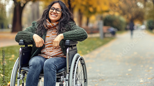 joyful, autumn, disabled, wheelchair, woman, park, smiling, happiness, leaf, path, nature, sweater, goggles, foulard, coiffure, relaxed, independence, freedom, health, lifestyle, positive, walking, tree, orange, yellow, serene, empowerment, mobility, sunny, fresh, fashion, leisure, vibrant, cheerful, happy, comfortable, inclusion, sidewalk, casual attire, inspiring, fall, optimism, confidence, journey, strength, motivation, resilience