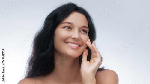 Joyful Beauty Model With Clear Skin Gently Touching Face in Studio Light