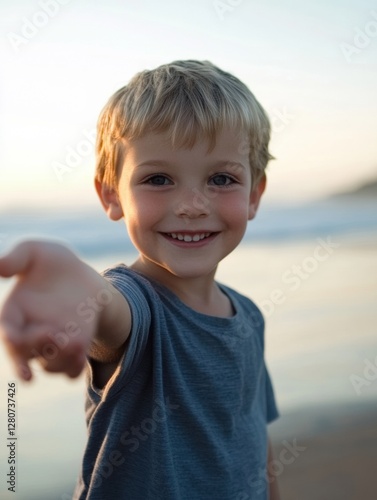 Joyful boy extending hand towards the camera during sunset at the beach, capturing a moment of happiness and playfulness. Generative AI