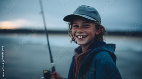 boy, fishing, beach, smile, cap, rod, adventure, outdoors, joyful, children, coastline, ocean, happiness, childhood, water, shore, evening, youthful, nature, fun, hobby, leisure, sea, wave, activity, casual attire, excitement, fresh, calmness, carefree, fresh air, marin, play, exploration, fishing trip, summer, portrait, recreation