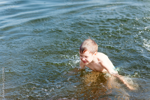 Joyful boy swimming in the lake and splashing in the water. Boy play in water in summer.