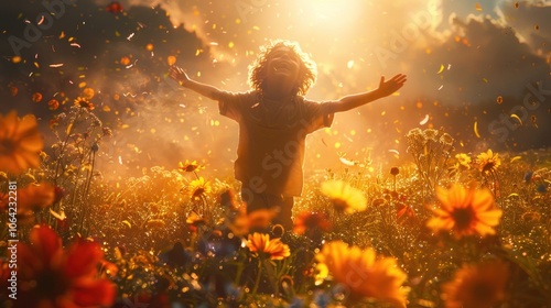 children, flower, field, happy, joy, sunshine, summer, nature, gold, meadow, light, sky, grass, blooming, bright, landscape, beautiful, green, sun, outdoors, playful, young, optimism, fresh, life, freedom, carefree, innocence, smile, joyful, peaceful, cheerful, whimsical, vibrant, daisy, wildflower, natural