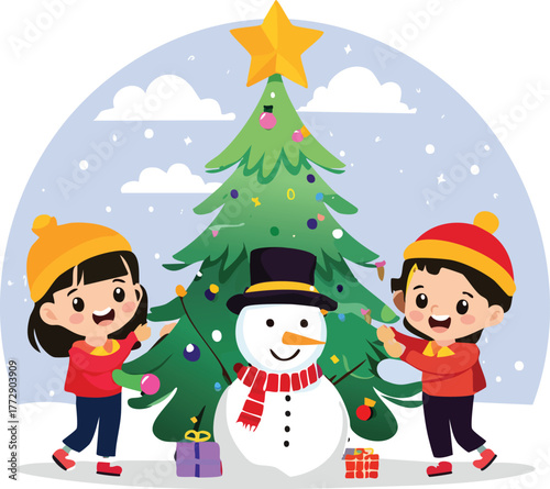 christmas, winter, children, children, decorating, christmas tree, snowman, snow, festive, holiday, present, gift, happy, joy, celebration, season, fun, friends, family, childhood, illustration, vector, cartoon, winter landscape, cold, hat, foulard, cheerful, adorable, cute, graphic, background, december, tradition, christmas, activity, playing, smile, together