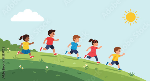 children, running, outdoors, sunny, landscape, group, children, race, fun, activity, childhood, happy, summer, grass, nature, park, play, hill, carefree, energy, game, youth, together, freedom, sky, sunlight, recreation, friends, field, well-being, wellness, healthy, exercise, leisure, positive, active, animated, drawn, cartoon, illustration, colourful, vibrant, playful, joyous