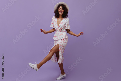 Joyful dark-skinned lady in white polka dot dress smiles widely on purple background. Happy curly woman in hat moves on isolated.