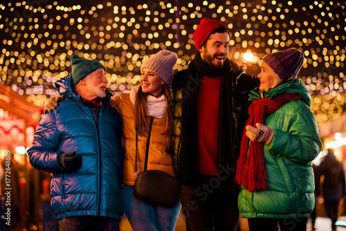 Joyful family and friends celebrate together at a festive outdoor market under twinkling lights with warm coats and smiles during a merry Christmas night