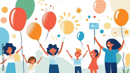 joyful, family, balloon, celebration, sunny, happiness, children, colourful, outdoors, fun, togetherness, smiling, cheerful, event, party, gathering, festive, bright, community, illustration, oneness, playful, vibrant, sun, blue, orange, together, enjoyment, activity, decorative, leisure, summer, social, uplifting, excitement, lively, landscape, diversity, positive
