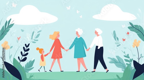grandmother, granddaughter, holding, hand, walking, lush, park, celebrate, bond, family, mother, joining, them, background, all, dressed, light, colourful, spring, attire, joy, nature, happiness, togetherness, woman, girl, friendship, lifestyle, garden, community, affection, summer, relaxation, young, elderly, youth, warmth, love, connection, serene, landscape, beauty, foliage, floral, butterfly