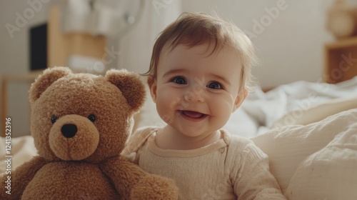 Joyful infant boy with curly hair happily sitting on a cozy bed holding a soft brown teddy bear in a warm, bright room setting.