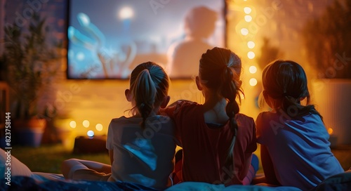 children, watching, motion picture, projector, garden, home, sitting, enjoying, fun, moment, family, time