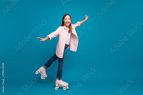 Joyful preteen girl roller skating on vibrant blue background showcasing stylish casual outfit and lively fun