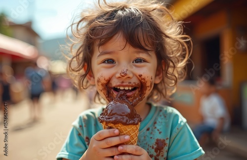 Joyful toddler with messy face eats chocolate ice cream cone. Curly haired child smiles widely. Messy eating signifies playful childhood learning and pure delight in a sweet treat.
