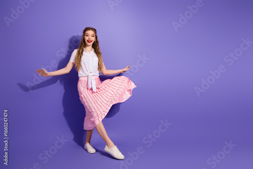 Joyful young woman dancing cheerfully in summer fashion on a vibrant purple backdrop wearing a casual stylish outfit