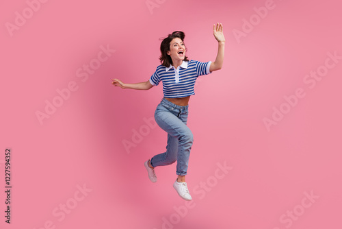 young, female, girl, pink, background, smile, happy, fashion, casual attire, jean, striped, top, knitwear, polo, trendy, brunette, hair, model, beautiful, attractive, charming, girlish, funny, leisure, lifestyle, summer, advertising, shopping, promoting, joyful, excitement, jump, movement, style, energetic, vibrant, active, woman, student, t-shirt, up, trampoline, flight, fly, air, jumper, funky, carefree, sale, positive
