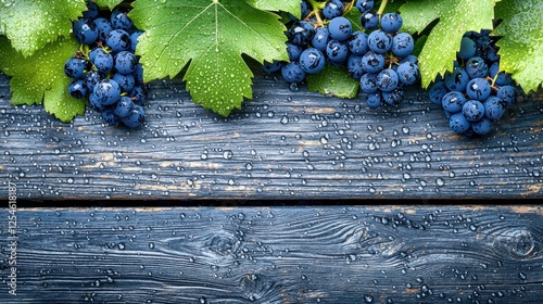 grape, wine, vinery, fruit, blue, berry, food, nature, harvest, fresh, juicy, delicious, organic, dark, wood, wooden, table, background, rustic, texture, wet, water, drop, leaf, leaf, green, photo, still, life, closeup, macro, top, view, summer, autumn, vintage, image, picture, photo, gastronomy