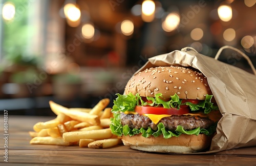 Juicy burger with lettuce, tomato, cheddar cheese, open brown bag, French fries, fast food restaurant background