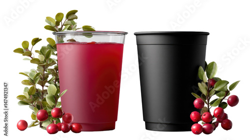 Juicy Delight: A refreshing splash of a fruity red drink and a contrasting blank cup, alongside sprigs of berries and vibrant leaves.