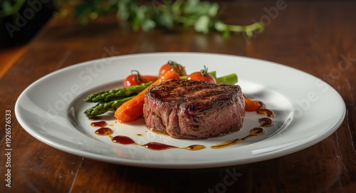 Juicy medium rare grilled steak served with a side of vegetables