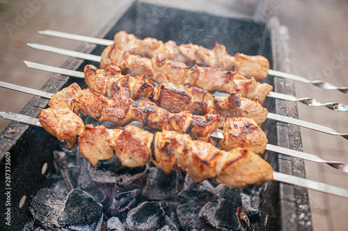 Juicy slices of meat with sauce prepare on fire shish kebab . BBQ outside.
