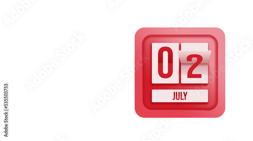 July 2nd. Day 2 of month, Calendar date. Calendar in the form of a mechanical scoreboard red timetable tableau on white. Summer month, day of the year concept.