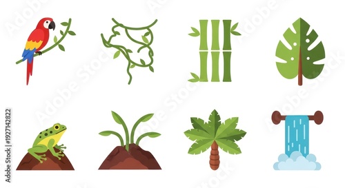 parrot, frog, jungle, tropical, nature, wildlife, animal, leaf, plant, vine, bamboo, tree, waterfall, flora, fauna, green, red, blue, yellow, brown, illustration, vector, design, element, isolated, icon, graphic, cartoon, art, creative, style, flat, decorative, educational, concept, environment, natural, resource, background, wild, exotic, growth, summer, sunlight, tree branch, realistic