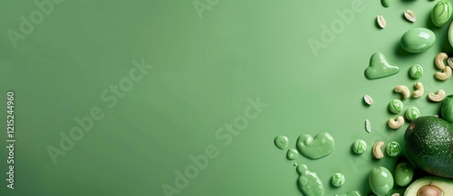 Keto diet concept - salmon, avocado, eggs, nuts and seeds, bright green background, top view
