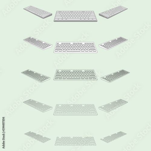 keyboard vector illustration. a set of colored and line art. from the tilt angle along with the front view.