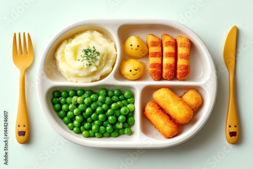 Kid plate with mashed potatoes, fish fingers, peas and smiling potato snacks