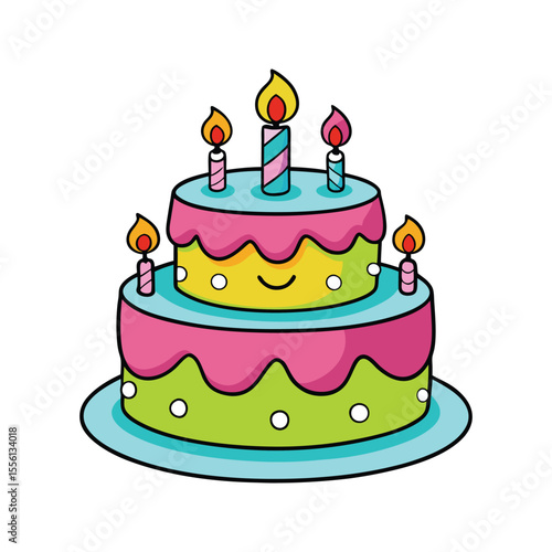 Kids birthday cake with fun decorations like balloons and stars vector illustration isolated on white background
