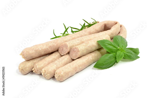 sausage, meat, sausage, white, isolated, pork, leaf, rosemary, condiment, basil, herb, breakfast, snack, food, meal